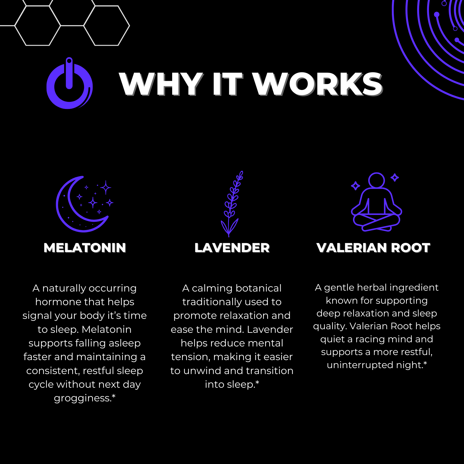 A naturally occuring sleep hormone, melatonin helps support your body's natural sleep cycle and signals to your body when it's to rest.
